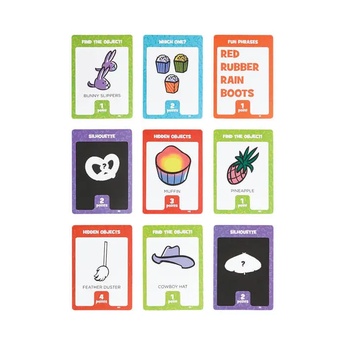 - 150 game cards with 5 different categories of ways to find objects. Search using a silhouette hint or a fun phrase that describes the hidden object.